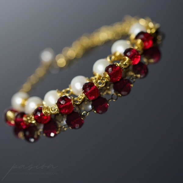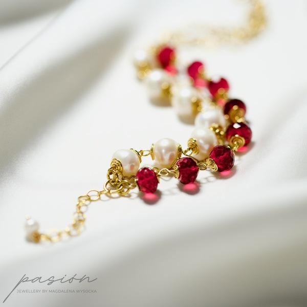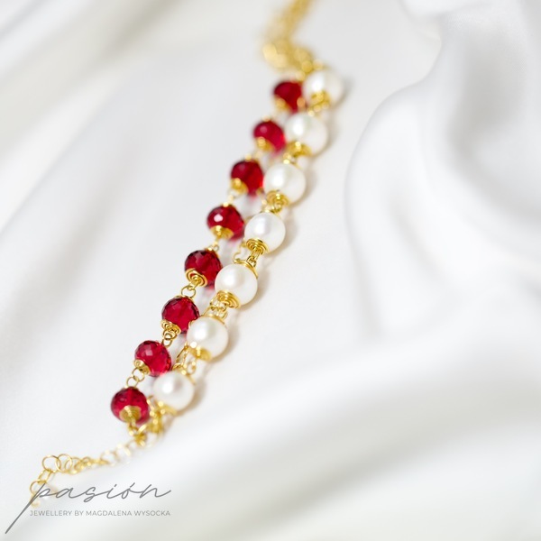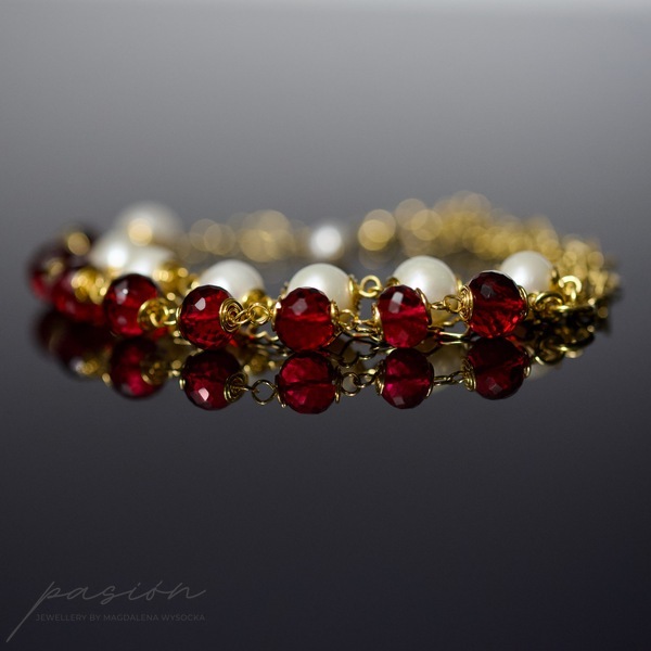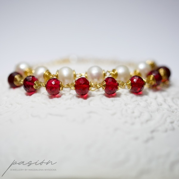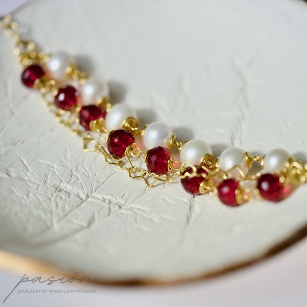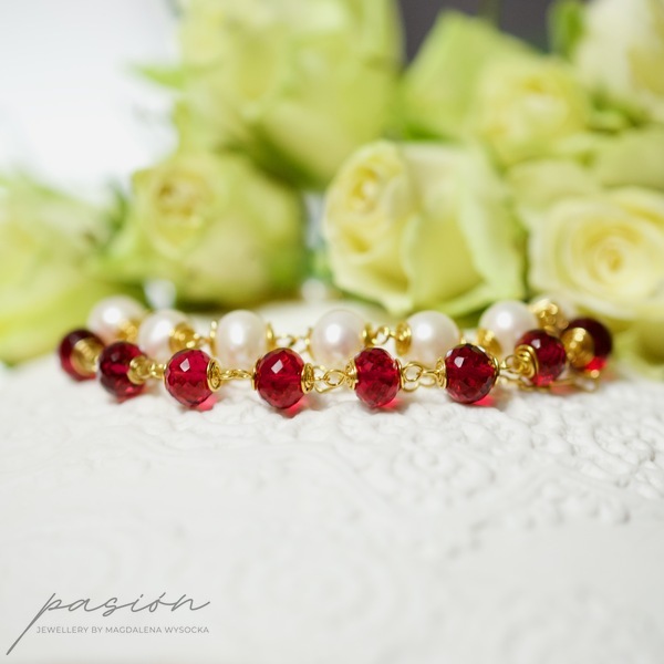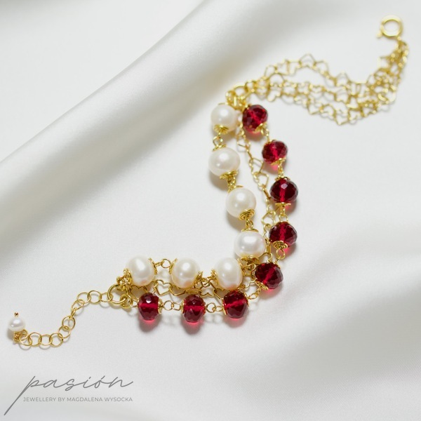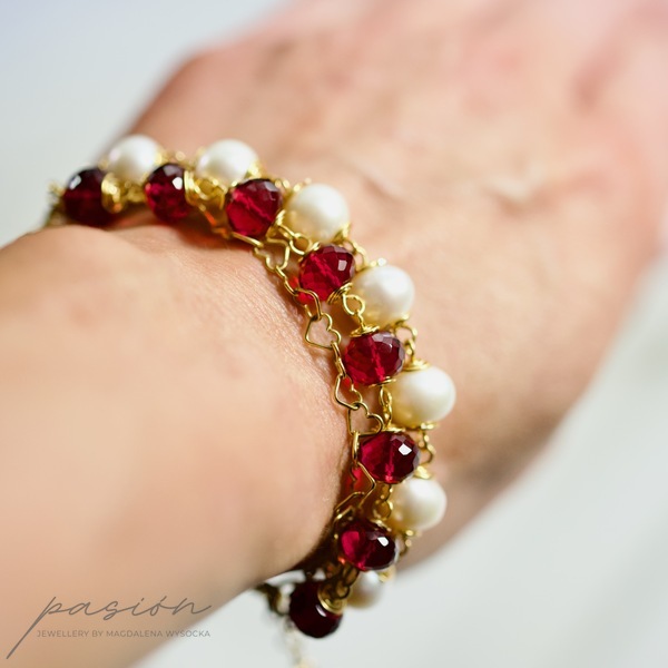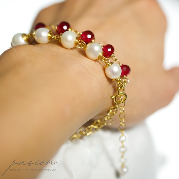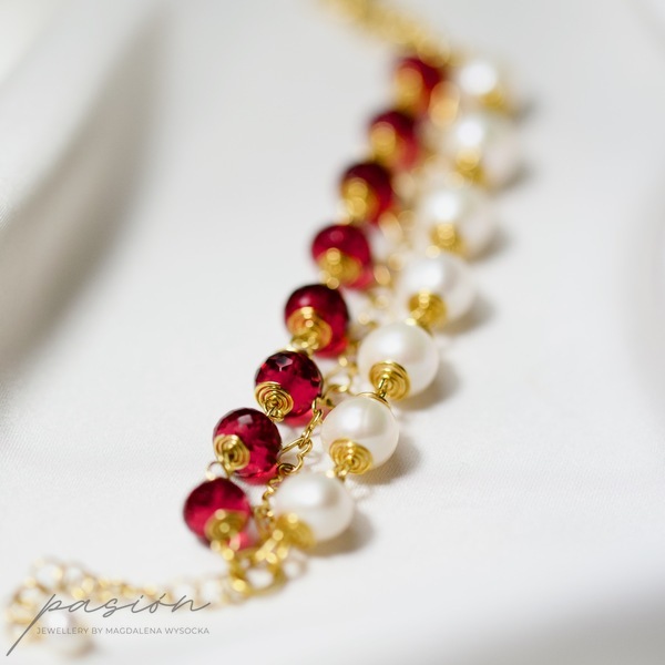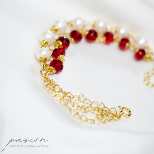 Bransoletkę tworzy sznur naturalnych Pereł słodkowodnych oraz sznur przepięknie fasetowanych Kwarcy czerwonych, w otoczeniu złotych spiralek i łańcuszków z motywem serc.