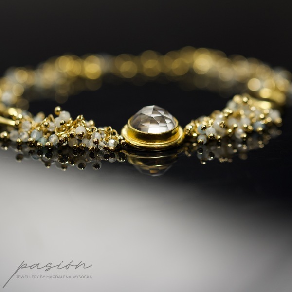 Sercem bransoletki jest oprawiony Kryształ górski o niezwykłym szlifie "rose". Po dwóch jego stronach znajduje się duża ilość fasetowanych kul Akwamarynów oraz złocone kółeczka. Bransoletka może stanowić komplet z kolczykami i naszyjnikiem o tej samej nazwie.