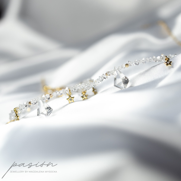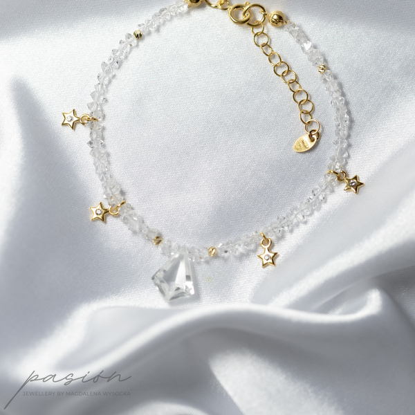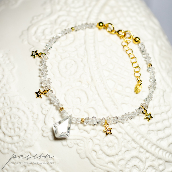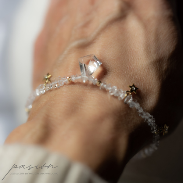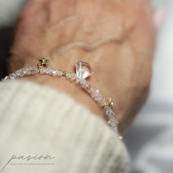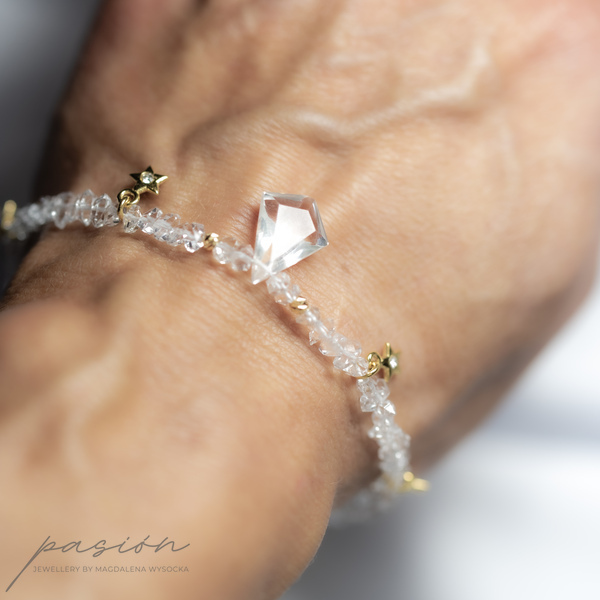 Centrum bransoletki stanowi Kryształ górski oszlifowany na kształt latawca w otoczeniu sznura surowych Kryształów górskich imitujących diamenty Herkimer oraz malutkich gwiazdek z kryształkiem Preciosa.