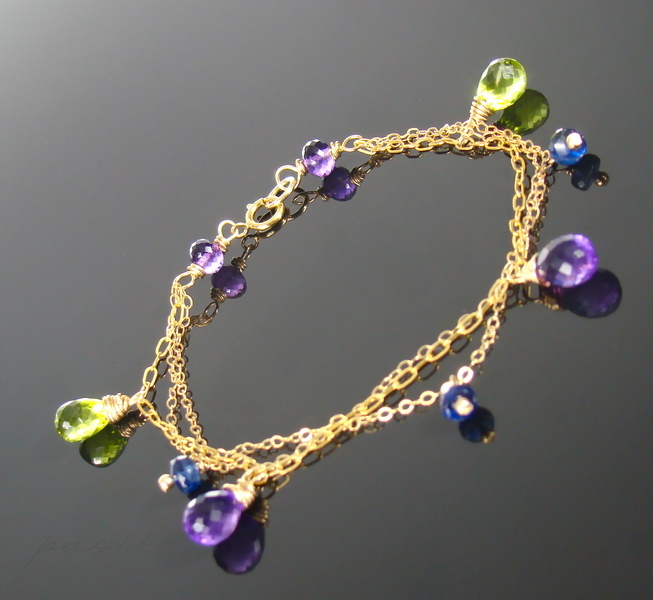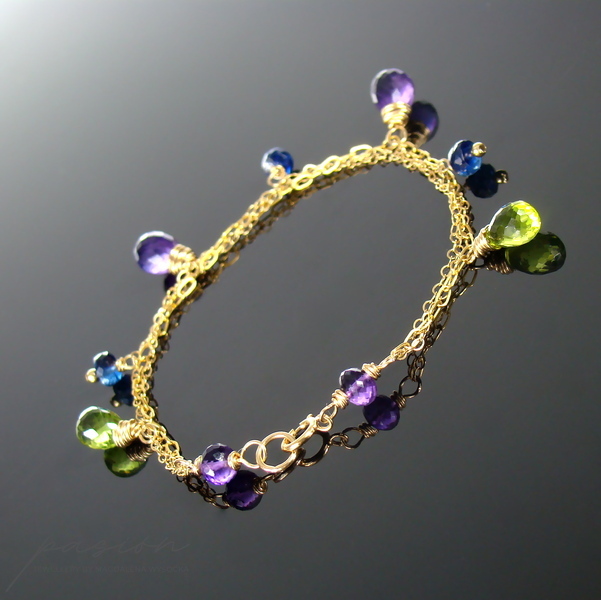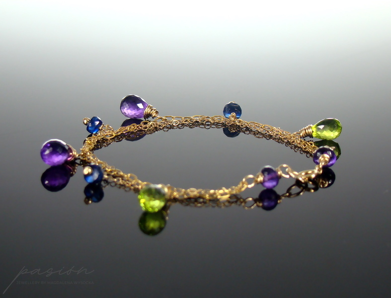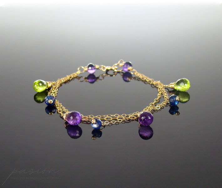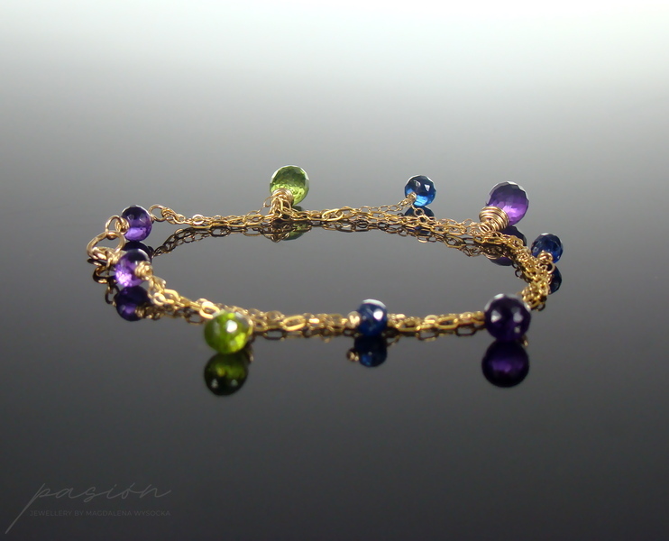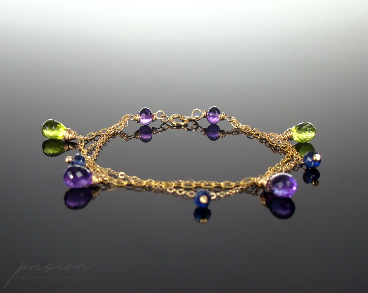 Złota bransoletka glamour bogata w fasetowane kamienie szlachetne o najmodniejszych barwach i różnych kształtach: purpurowe Ametysty, kobaltowe Kianity oraz Peridoty o ognistym odcieniu zieleni.