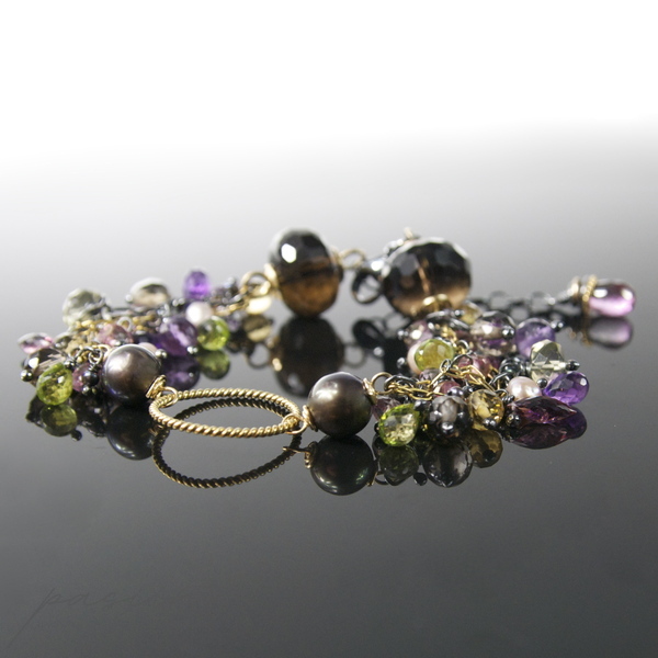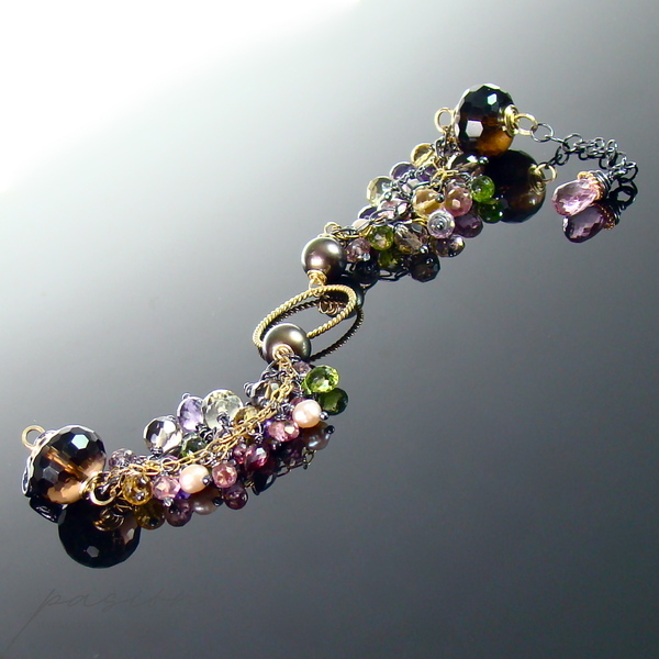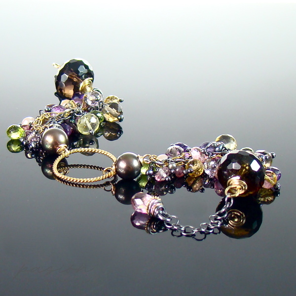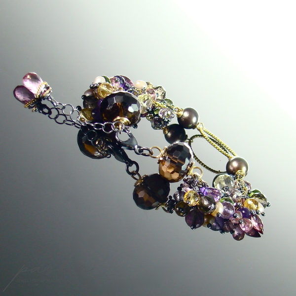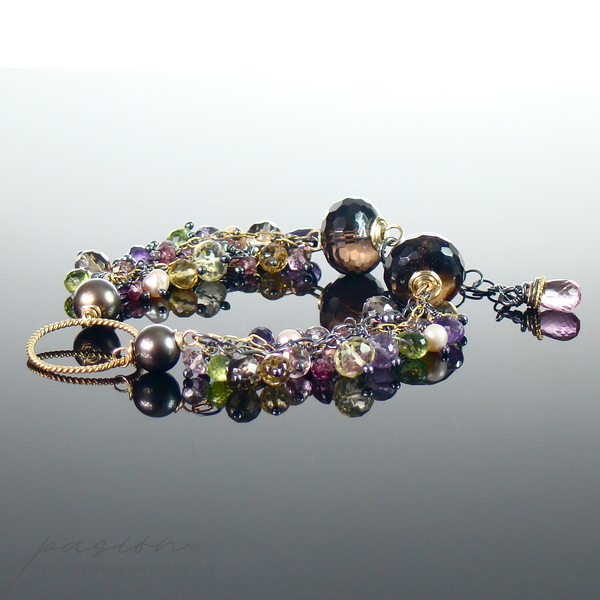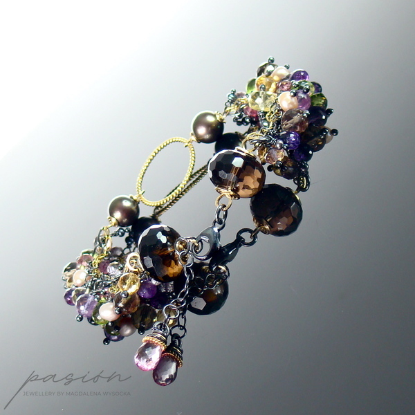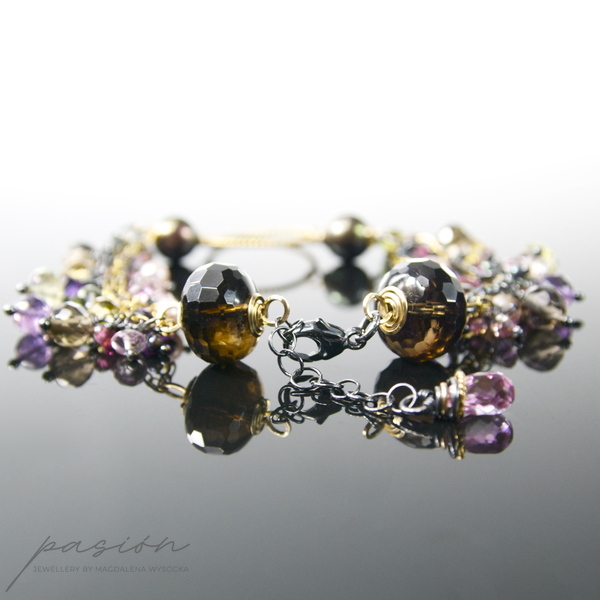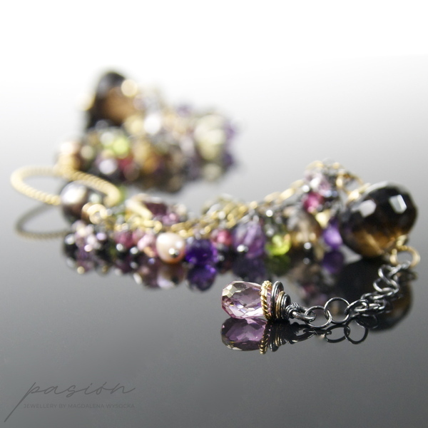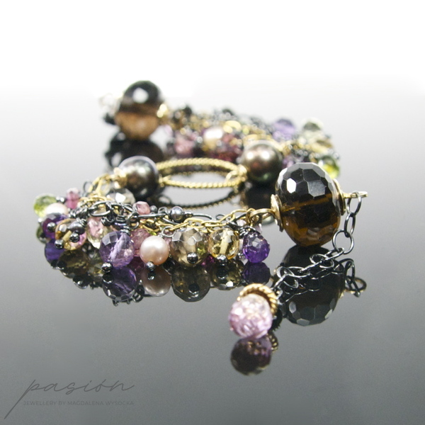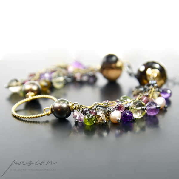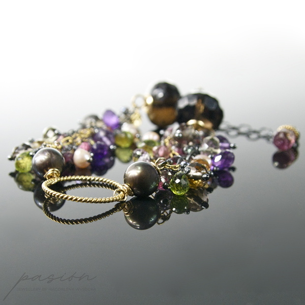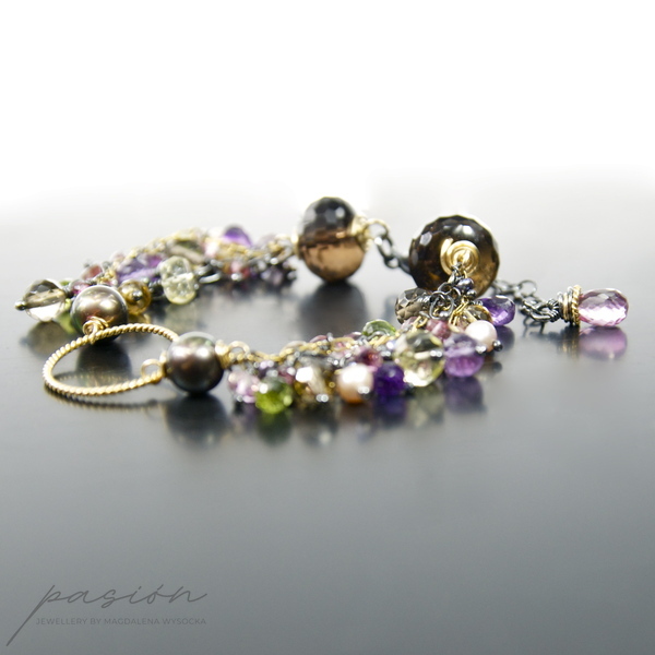 Na trzech łańcuszkach zawisły fasetowane kamienie w odcieniach letnich kwiatów: mistyczne różowe Topazy, Turmaliny, Ametysty fioletowe i lawendowe, Kwarce dymne, Peridoty, lemonkowe Kwarce, Perły słodkowodne w odcieniu "peacock", naturalnie różowe Perły słodkowodne, Cytryny oraz Rodolity. W centralnej części znajduje się spiralnie skręcone koło ze stopu Vermeil (srebro pokryte 24ct złotem).