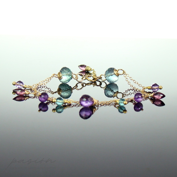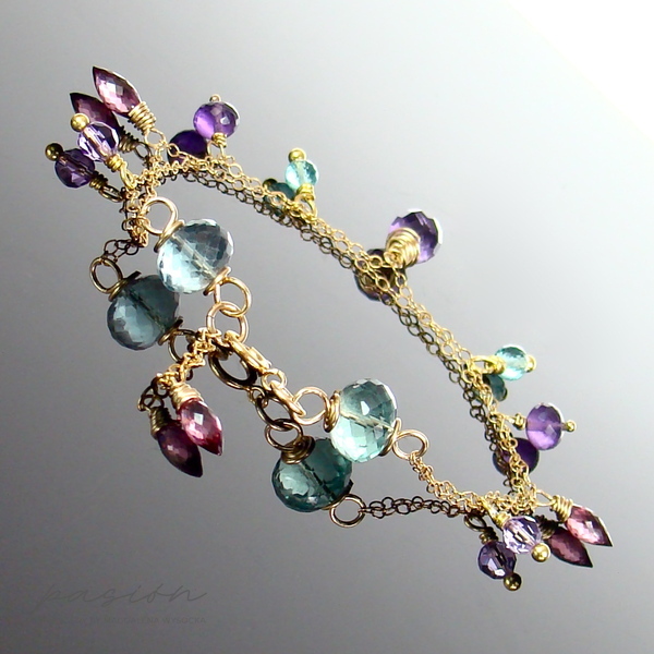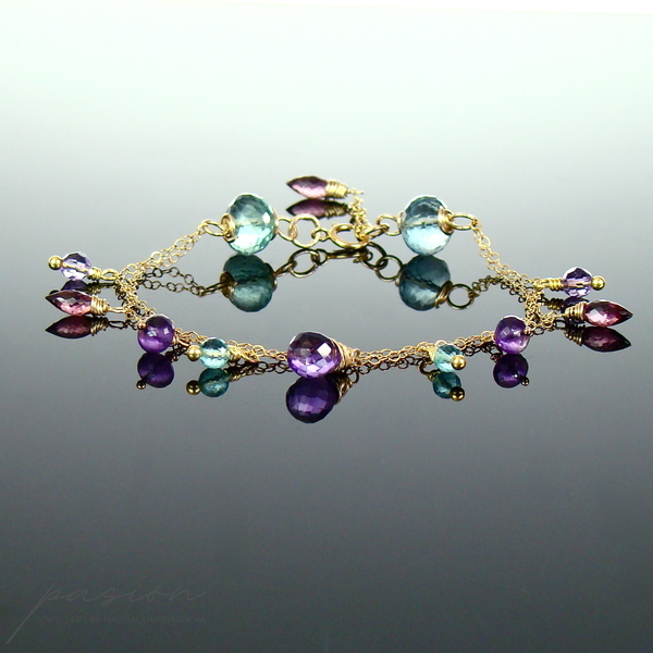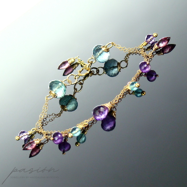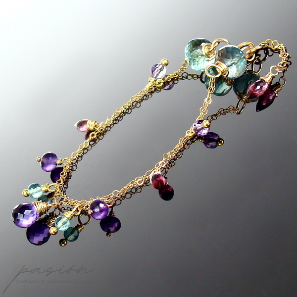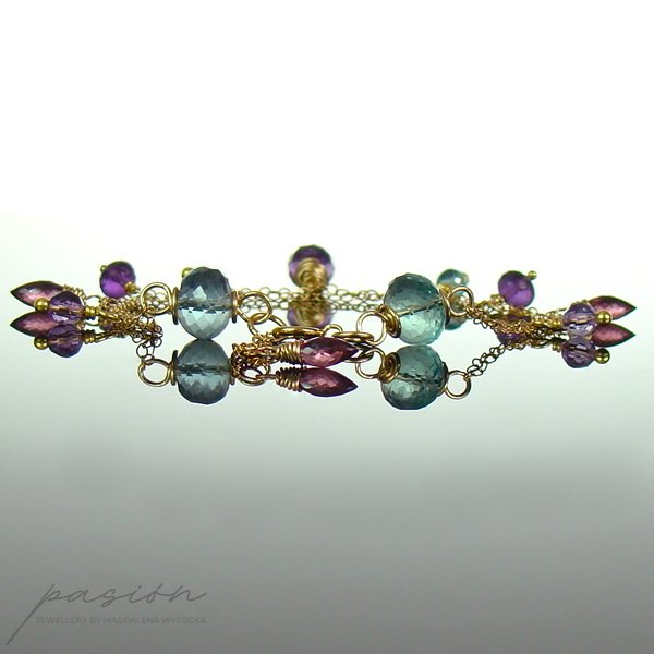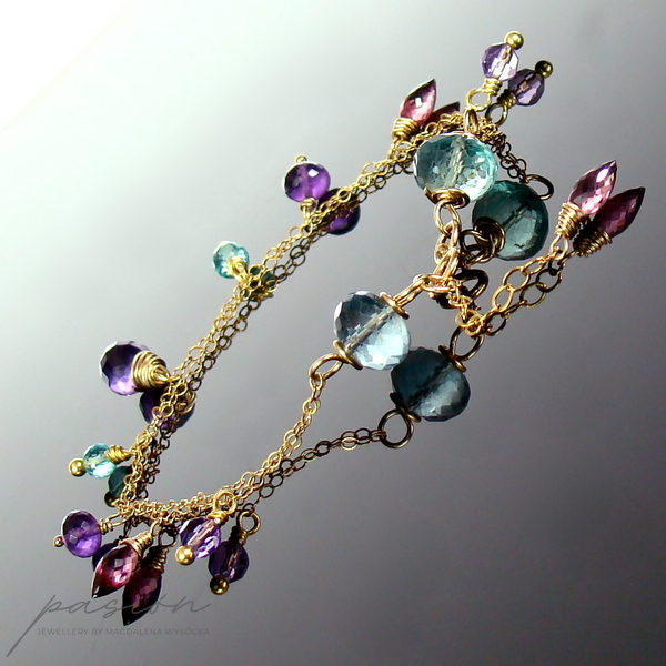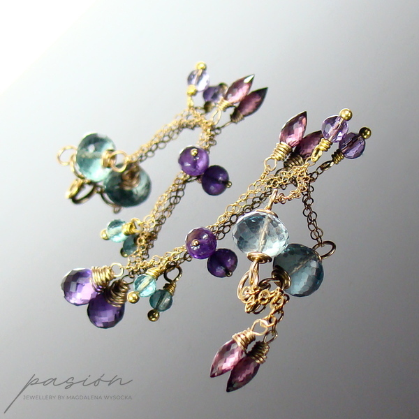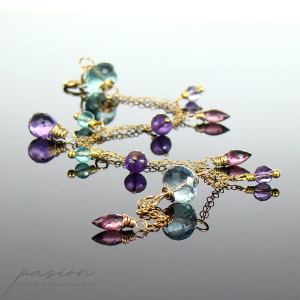Na dwóch łańcuszkach o drobnych ogniwach wykonanych ze stopu 14ct Gold Filled zawisły fasetowane kamienie: Fluoryty i Apatyty w odcieniu tropikalnej zieleni, ciemnoróżowe Rodolity, purpurowe oraz lawendowe Ametysty. Złote szpilki wykonane są ze stopu Vermeil (srebro pokryte 24ct złotem).