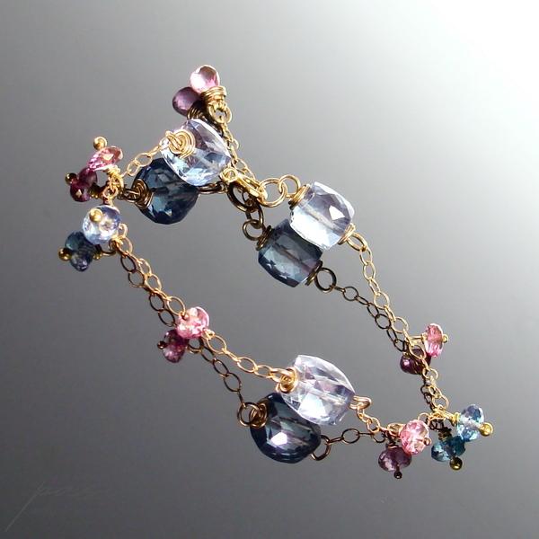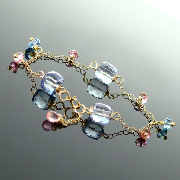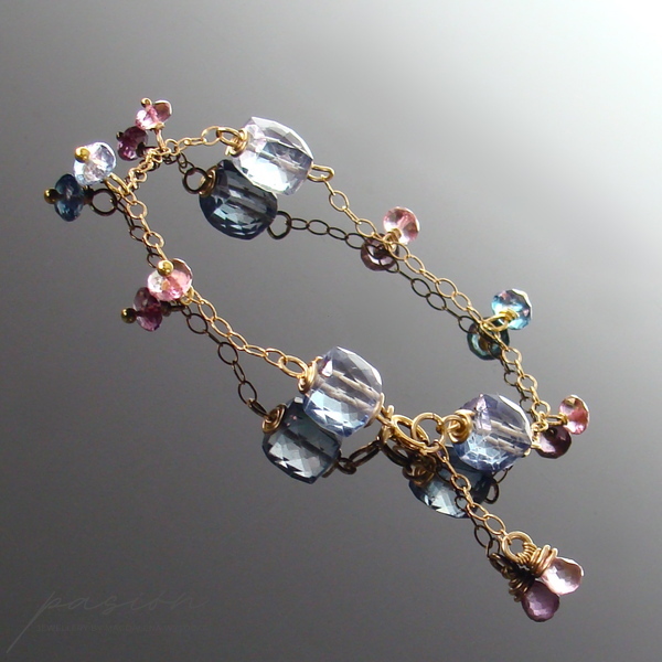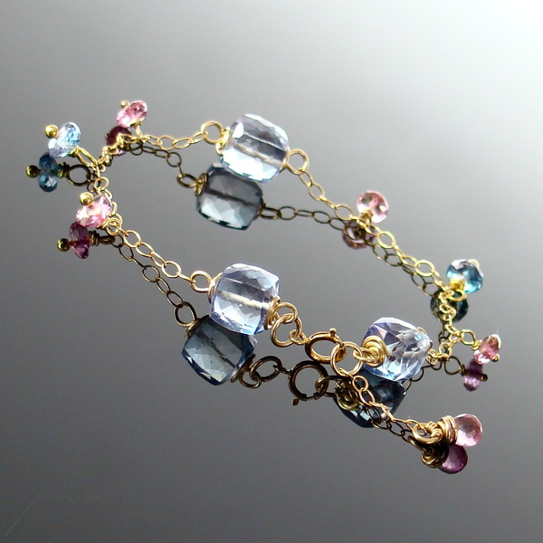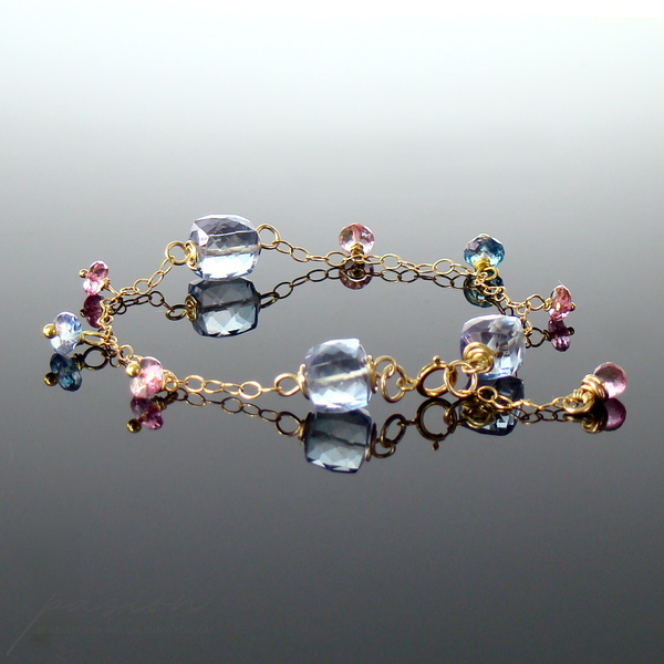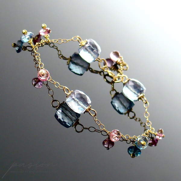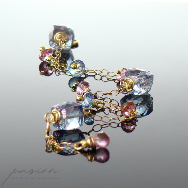 Na złotym łańcuszku (stop 14ct Gold Filled) intensywnie lśnią mistyczne, fasetowane Topazy: kostki i oponki niebieskich Topazów oraz oponki i kropla (na łańcuszku przedłużającym) różowych Topazów. Złote szpilki wykonane są ze stopu Vermeil (srebro pokryte 24ct złotem).