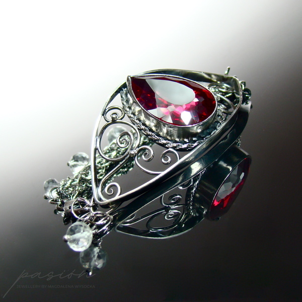 Sercem bransolety jest spektakularny czerwony Topaz o najwyższej jakości i niebywałym szlifie wydobywającym jego niespotykany blask. Topaz został oprawiony w srebro i otoczony srebrnymi zdobieniami w towarzystwie lśniących diamentowo białych Topazów zawieszonych na wielu łańcuszkach bransolety.