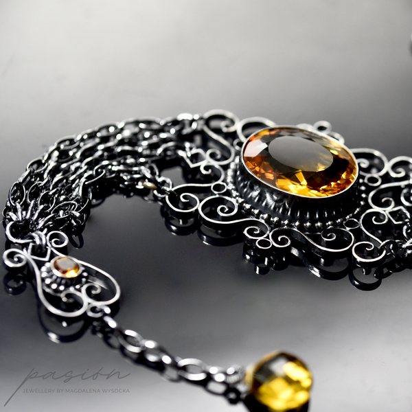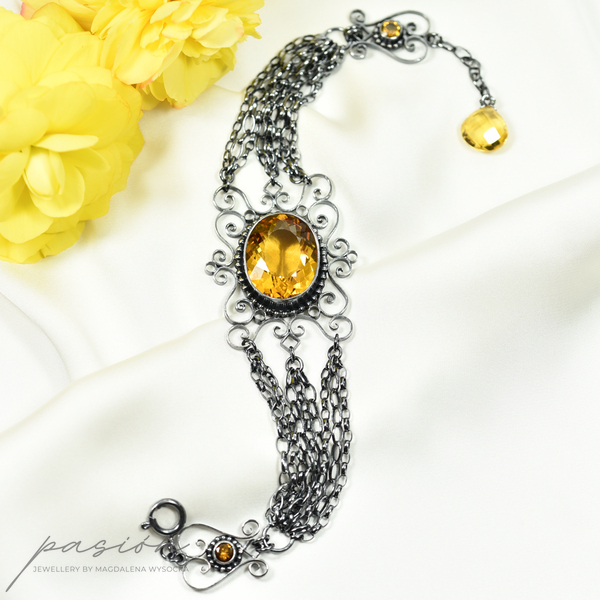 Okazała, srebrna bransoleta w stylu wiktoriańskim wykonana ręcznie z oksydowanego na czarno srebra próby 925, ozdobiona najwyższej jakości fasetowanym, ciemnozłocistym Cytrynem w kształcie owalu oraz brioletką Cytrynu w kształcie odwróconego serca.