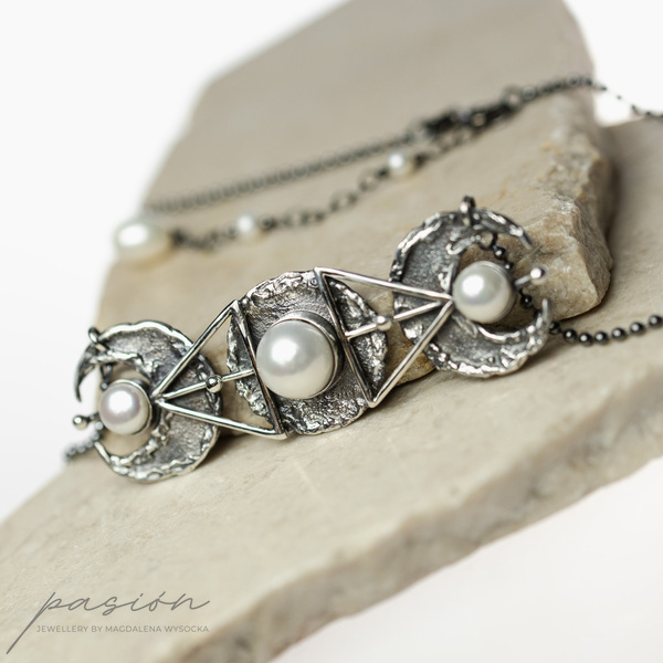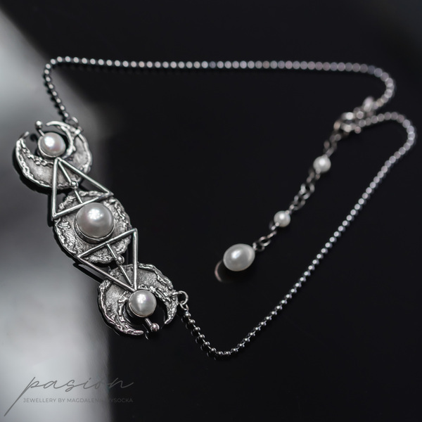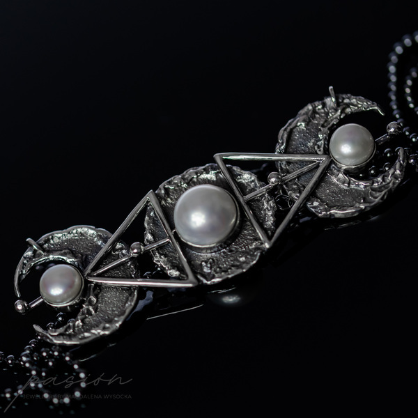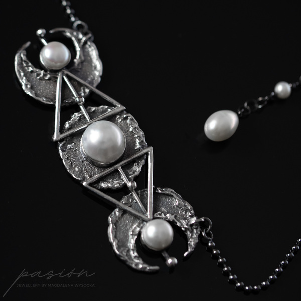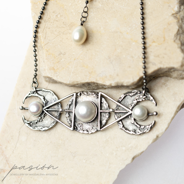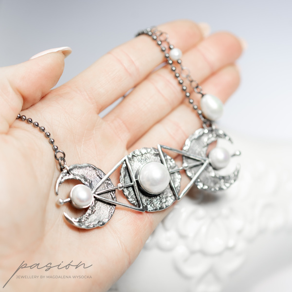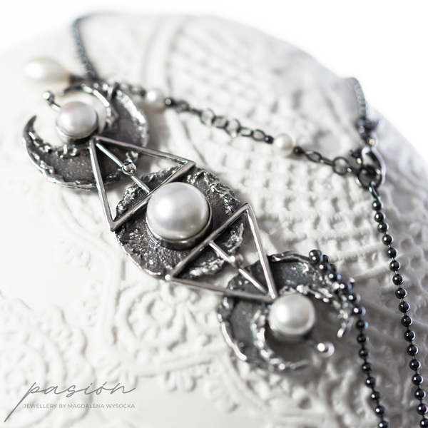 Monochromatyczny efektowny naszyjnik wykonany od podstaw ręcznie ze srebra pierwszej próby 925 i 999, inspirowany trzema fazami księżyca połączonego ze świętą geometrią.