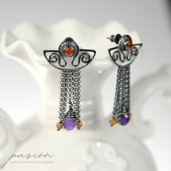 Kolczyki zostały wykonane ręcznie z intensywnie zoksydowanego na czarny, wysoki połysk srebra próby 925, pomarańczowych Karneoli oraz brioletek brazylijskich Ametystów.