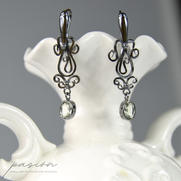 Zoksydowane na czarny kolor i wypolorowane srebro doskonale komponuje się ze szlachetnym odcieniem zieleni Ametystu oprawionego w srebro. Na życzenie Klienta, kolczyki mogę wypolerować tak, by uzyskać jaśniejszy odcień srebra.