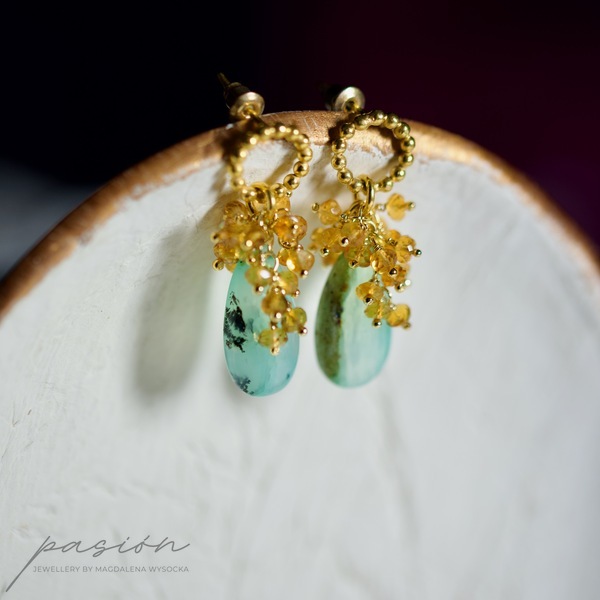 Kolczyki ozdobione są kroplami zielonych Opali dendrytowych (każdą sztuka ma inne wzory dendrytowe) oraz kaskadą Cytrynów Madeira o intensywnej ciemnożółtej barwie, w otoczeniu złoconych elementów.