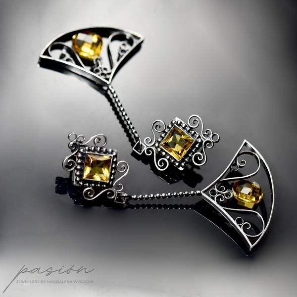 Kolczyki wykonane zostały ręcznie z oksydowanego na czarno srebra próby 925, ozdobione najwyższej jakości fasetowanym, złocistymi Cytrynami o kwadratowym kształcie oraz brioletką Cytrynu w kształcie odwróconego serca.