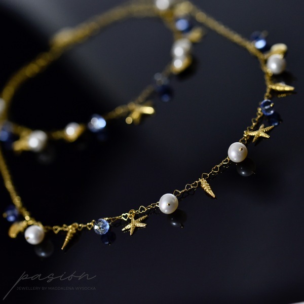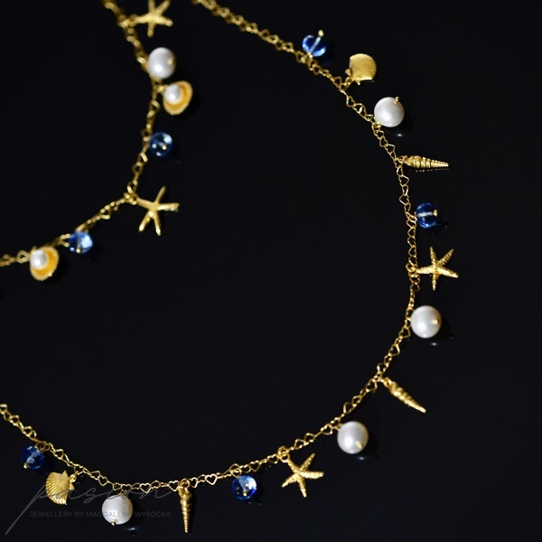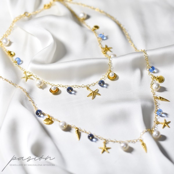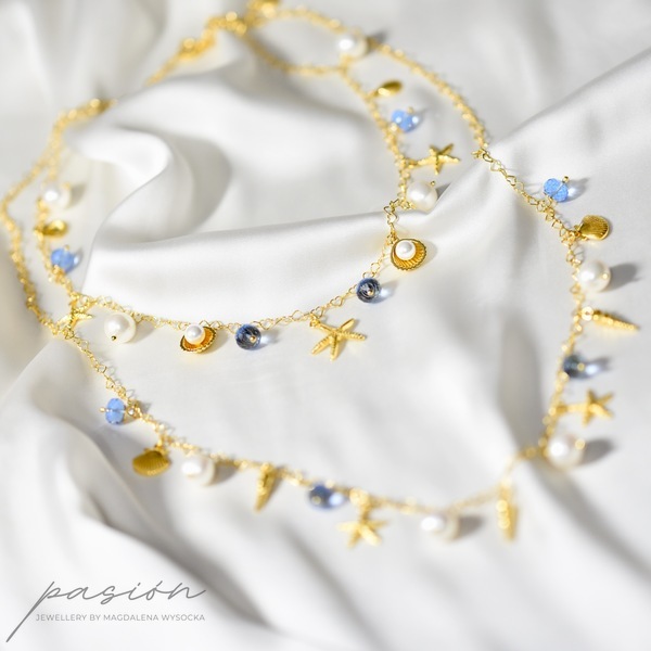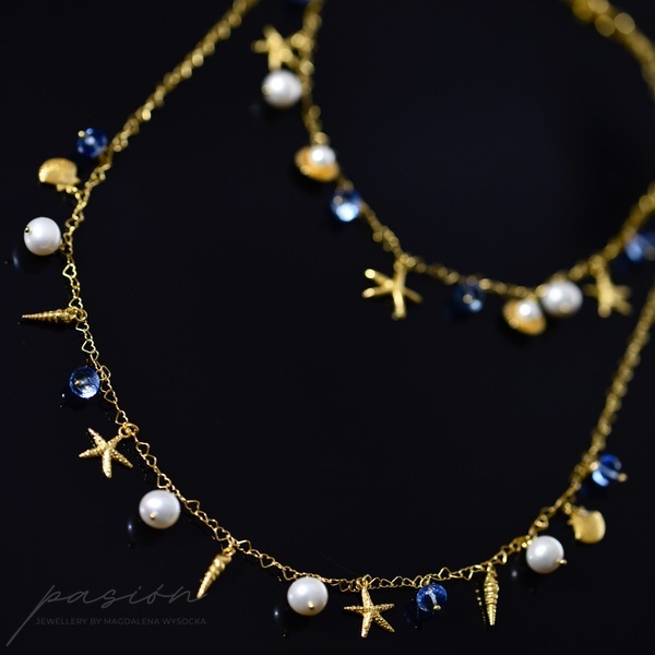 Romantyczny, wakacyjny dwuwarstwowy naszyjnik z kolekci "Morskie Opowieści" wykonany od podstaw ręcznie ze srebra pierwszej próby 925 złoconego czystym 24 ct złotem. Naszyjnik ozdobiony został morskimi zawieszkami: rozgwiazdami, muszelkami z naturalną perłą, muszelkami oraz muszlami, a także naturalnymi białymi Perłami oraz niebieskimi fasetowanymi Kwarcami w odcieniu tanzanitowym