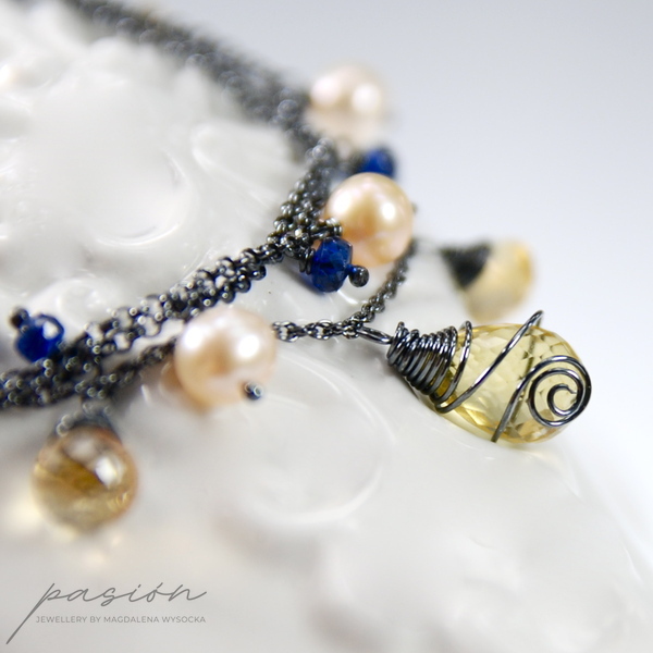 Lekka, srebrna bransoletka z kolekcji THE GOOD FEELING wykonana ręcznie ze srebrnych łańcuszków próby 925 zoksydowanych na lśniącą czerń. Całość ozdobiona jest naturalnymi fasetowanymi Cytrynami o różnym kształcie, granatowymi oponkami Kyanitów, naturalnymi Perłami w odcieniu brzoskwiniowym oraz przepiękną markizą kaszmirowego Kwarcu.