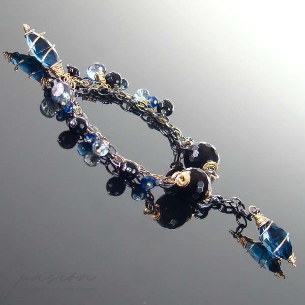 Bransoletka ozdobiona jest naturalnymi fasetowanymi kulami czarnego Onyksu, niebieskimi Topazami o różnym kształcie, granatowymi oponkami Kyanitów oraz przepięknymi markizami kaszmirowego Kwarcu.
