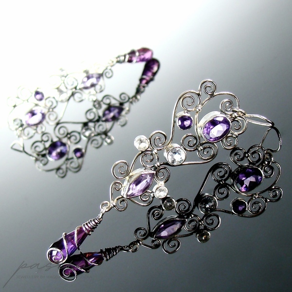 Kolczyki zostały ozdobione wieloma kamieniami o szlifie diamentowym, ale o róznych kształtach: Ametystami lawendowymi, Ametystami purpurowymi i Topazami białymi otoczonymi florystcznymi, srebrnymi wzorami. Na dole kolczyków zawisły fasetowane brioletki Ametystów otoczone srebrną spiralką. Bigle zostały wykonane ręcznie.