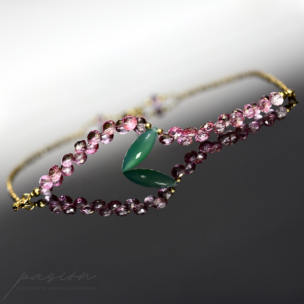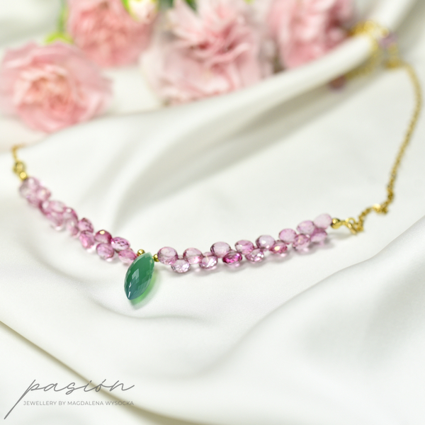 Centrum naszyjnika stanowi markiza mikrofasetowanego zielonego Onyksu, otoczona brioletkami różowych Topazów w kształcie cebulek.