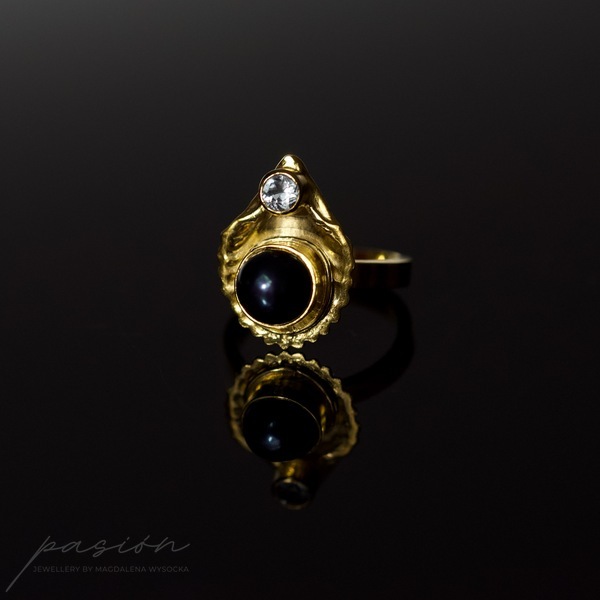 Pierścionek został wykonany ręcznie ze srebra pierwszej próby 925 i 999. Całość pracy została pozłocona czystym 24ct złotem.