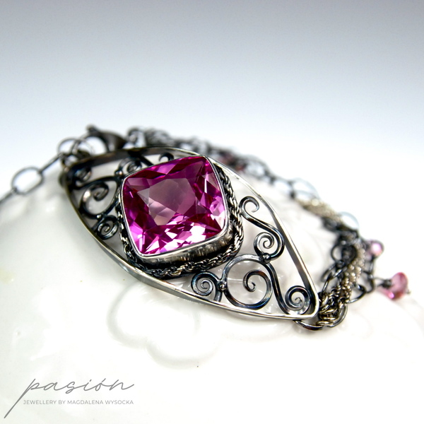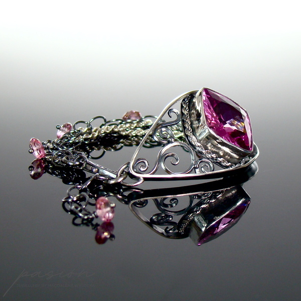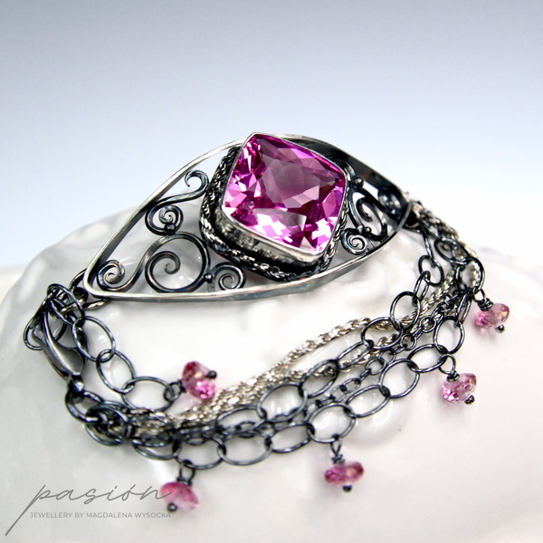 Nazdzwyczajnie kobieca, okazała bransoleta ozdobiona najwyższej jakości różowym Topazami w oryginalnym kształcie typu "cushion" oraz microfasetowanymi oponkami różowych Topazów zawieszonych na dużych łańcuszkach.