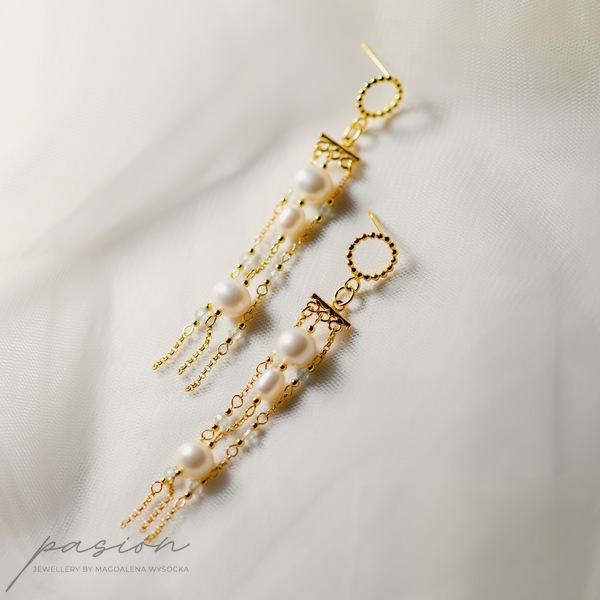 Kolczyki zostały ozdobione łańcuszkami pełnymi naturalnych Pereł w ksztacie kul i ryżu oraz fasetowanymi kulami Akwamarynów w odcieniu jasnoniebieskim.