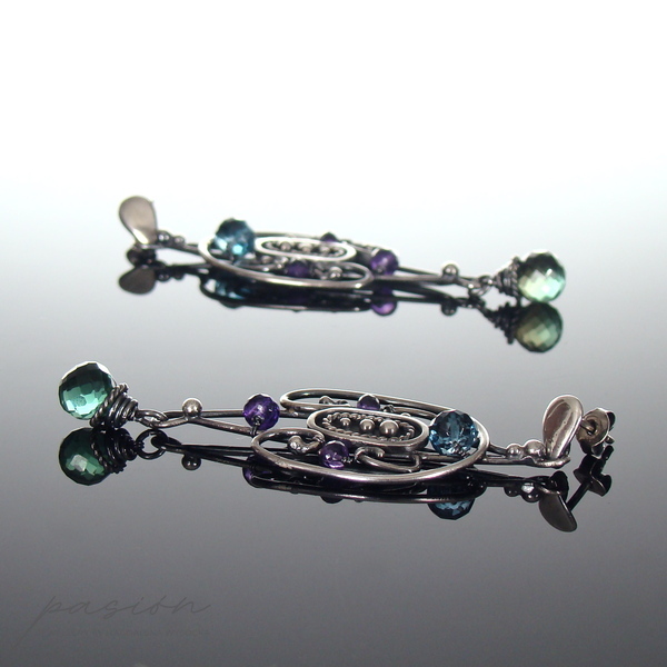 Kolczyki zostały wykonane ręcznie ze Srebra próby 925, umocowane do sztyftów, zoksydowane i w całości starannie wypolerowane.