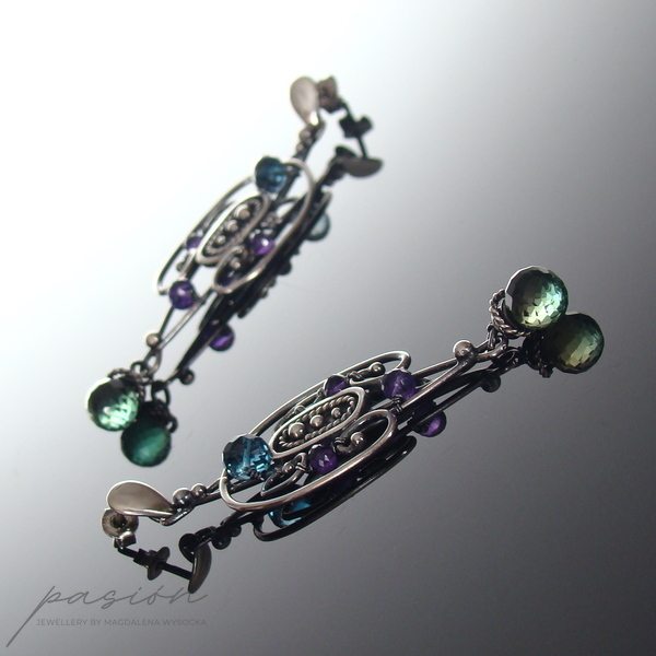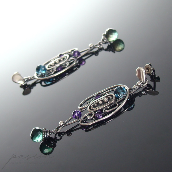 Na srebrnym ornamencie ozdobionym fasetowanymi Ametystami oraz unikalnym Topazem o kolorze London Blue zawisła brioletka Zielonego Kwarcu w odcieniu głębokiej, austriackiej zieleni.