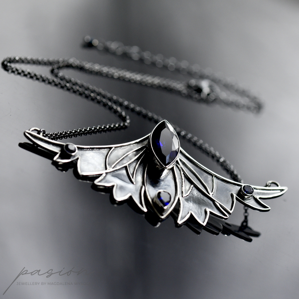 Naszyjnik został zoksydowany na czarno i wypolerowany miejscowo na wysoki połysk. Będzie idealną ozdobą dla pewnych siebie kobiet, które potrzebują w życiu uskrzydlenia.