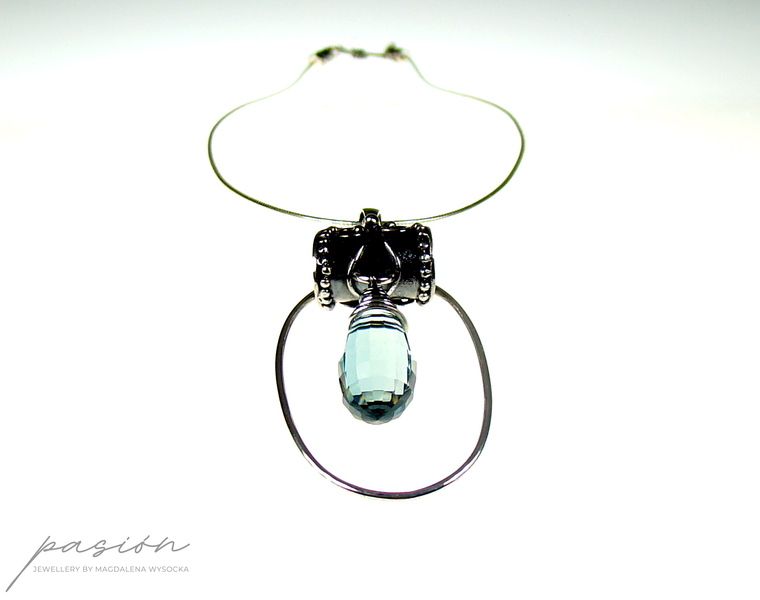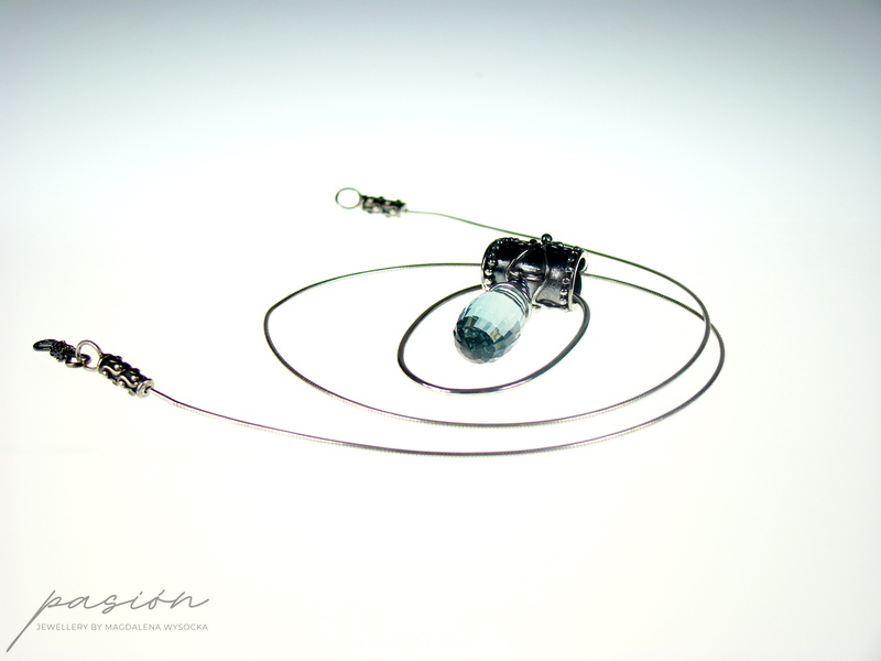 Srebrny naszyjnik w stylu Vintage przywołujący na myśl klejnoty z XVII wieku znalezione we wraku statku na dnie oceanu. Jego serce stanowi najwyższej klasy AAA brioletta Akwamarynu o głębokiej, morskiej barwie i rzadko spotykanym szlifie typu „step”. Otoczony srebrnym owalem Akwamaryn zawisł na efektownie zdobionym wisiorze. Srebrna linka została zakończona ozdobnymi zakończeniami w stylu Vintage współgrającymi z całością naszyjnika.