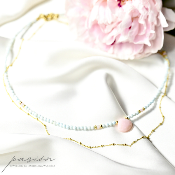 Niesamowity pastelowy odcień fasetowanych kul Larimaru i różowych Opali Peruwiańskich dodatkowo ozdabia złocony łańcuszek z drobnymi oponkami, stanowiąc idealne połączenie naturalnych kamieni z kolorem złota.