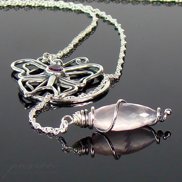 Ozdobiony malinowym Rodolitem (4mm) o szlifie diamentowym srebrny MOTYL został asymetrycznie umieszczony na srebrnym kółku, przez które przechodzi łańcuszek zakończony markizą mikrofasetowanego, najwyższej jakości, czystego Kwarcu różowego.