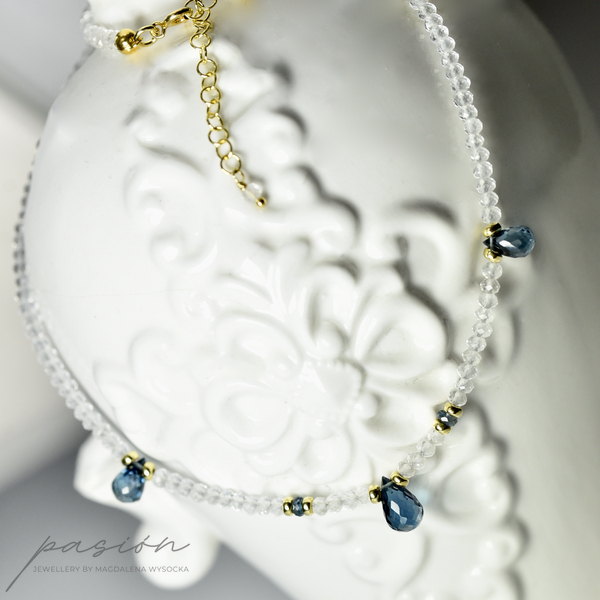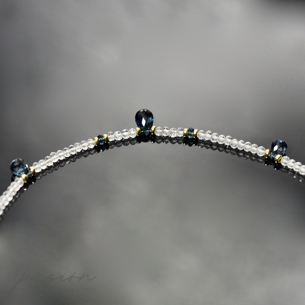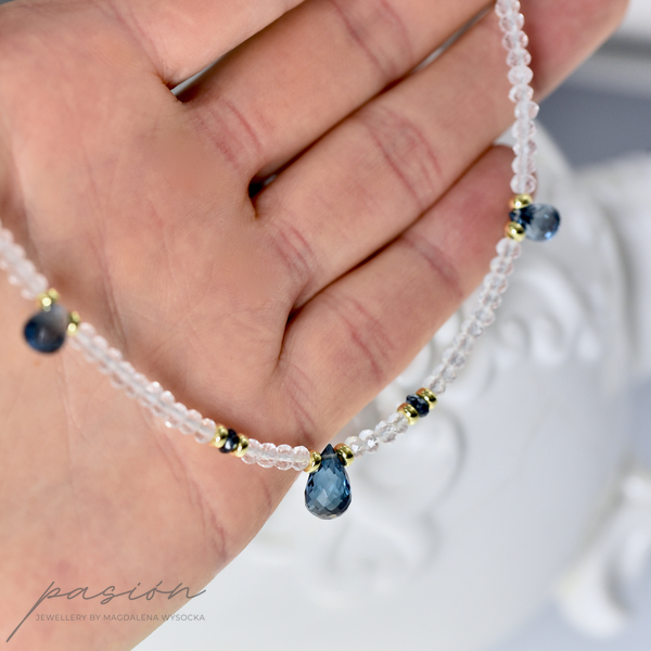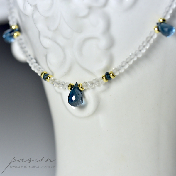 Naszyjnik został ozdobiony najwyższej jakości fasetowanymi brioletkami Topazów London Blue o ciemnogranatowym odcieniu, otulonymi mikrofasetowanymi oponkami białych Topazów o niezwykłym, diamentowym blasku.