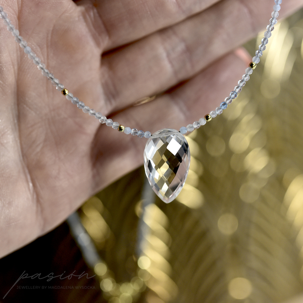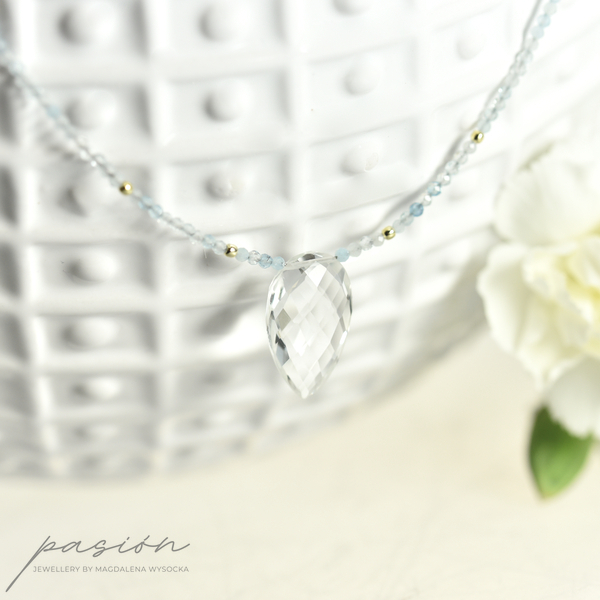 Krótki naszyjnik wykonany ręcznie z mikrofasetowanych kul Akwamarynów w wielu odcieniach błękitu, ozdobiony brioletką Kryształu górskiego o niezwykłym blasku.